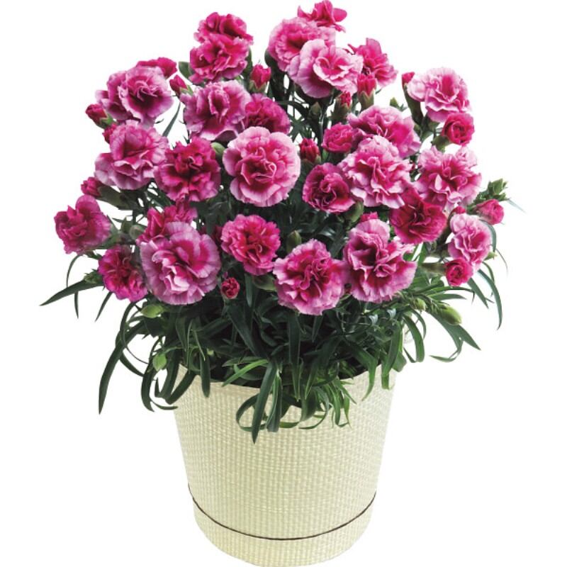 白色に縁取られるエレガントな赤紫のバイカラーカーネーションです。花束のようなボリュームで、株いっぱいに咲き誇ります。※花色は濃淡の幅が生じ、色の出方には個体差があります。