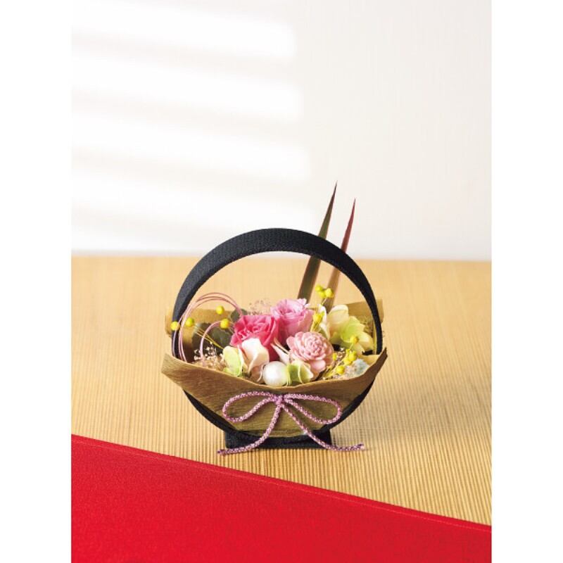 商品内容:●プリザーブドフラワー(バラ桃系2輪、カスミ草)、ドライフラワー(リンフラワー)、造花(ソラフラワー、アジサイ、グリーン)、水引、サテンピック、和紐、ラッピング、ちりめん花器(レーヨン・紙製)●お手入れのしおり付●花器=中国製