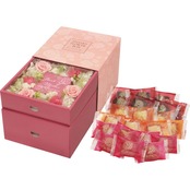 上段は華やかなプリザーブドフラワーボックス。下段はフレンチの人気店「レ ロジェ エギュスキロール」のひと口サイズのカラフルな焼き菓子をセットしました。母の日に、スイーツとプリザーブドフラワーが一緒に贈られる嬉しいギフトです。母の日のメッセージラベルをつけてお届けいたします。