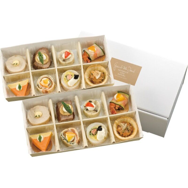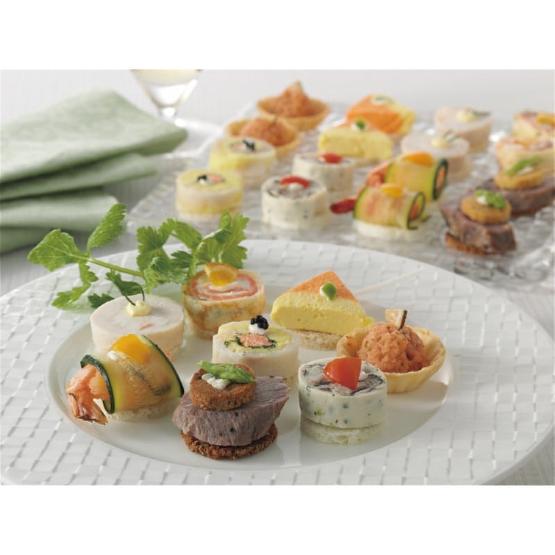 商品内容:●サーモンのタルタル、白身魚ロール、バジリコサーモン巻き、パプリカムース平目ハーブ漬け添え、海老のズッキーニ包み、森のきのこのテリーヌ、仔牛の西洋わさび添え、ロブスターと地鶏のポプリ計8種×各2