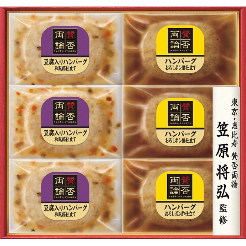商品内容:●賛否両論(ハンバーグおろしポン酢仕立て(豚肉・牛肉使用)・豆腐入りハンバーグ和風餡仕立て(鶏肉使用))各120g×各3