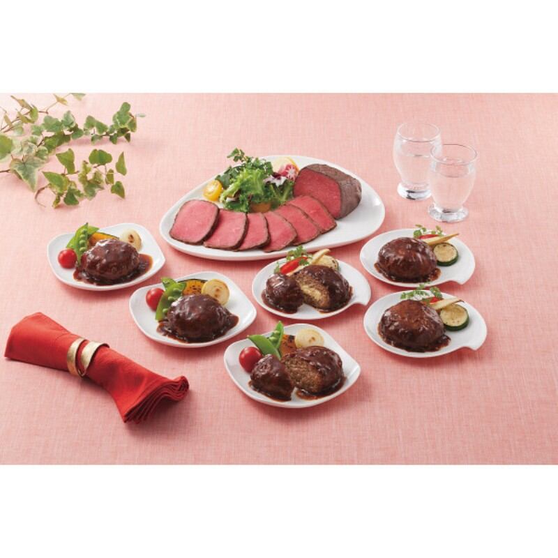 商品内容:●ローストビーフ(もも)200g、トリュフ入りグレイビーソース30g、デミグラスソースハンバーグ(牛肉・豚肉使用)・デミグラスソースチーズ入りハンバーグ(牛肉・豚肉使用)各120g×各3