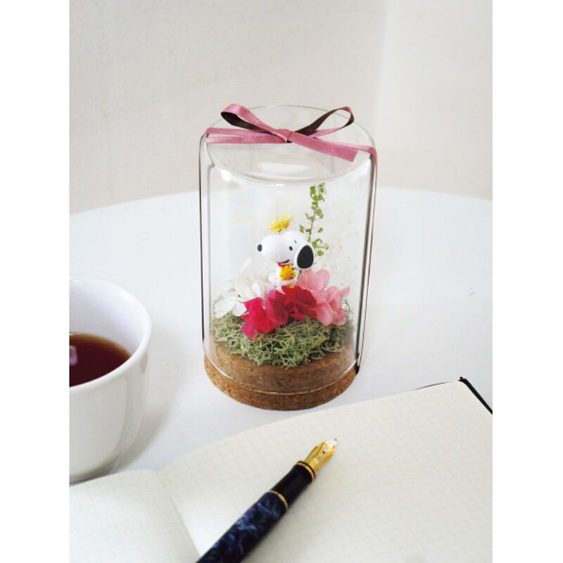テラリウム風に仕上げたガラスの中のお庭にカラフルなお花たちをアレンジしました。スヌーピーとウッドストックがハグするピックが大切な人を思う気持ちをお伝えします。