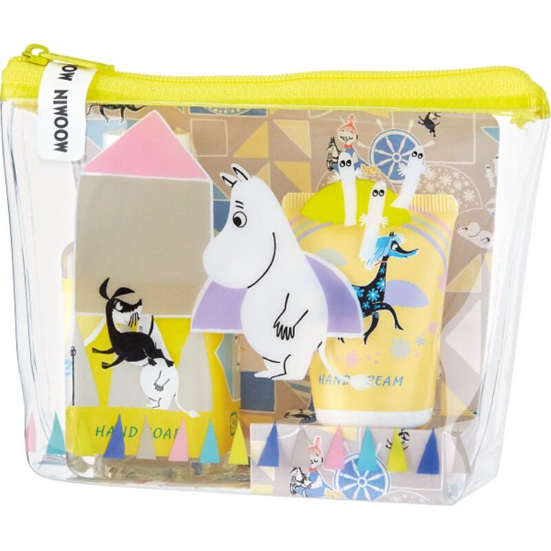 ムーミン谷の仲間たちが描かれたポーチに、ミニサイズのハンドソープとハンドクリームが入ったセット。小物が入れられる便利なポーチ入り。小物が入れられる便利なポーチ入り。