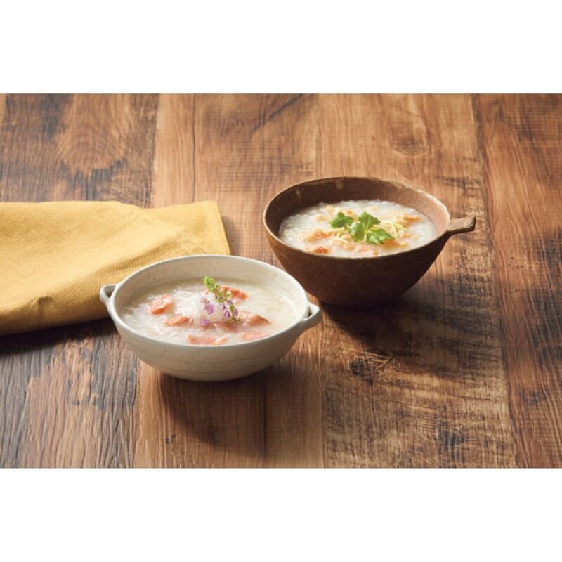 温めるだけで簡単にご自宅でお楽しみいただける「かに雑炊」「紅鮭雑炊」の詰合せです。