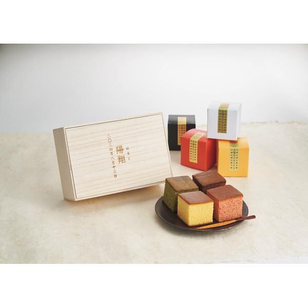 キューブタイプのカステラ4種(プレーン・宇治抹茶・ショコラ・いちご)を紙箱に入れ、名入れした桐箱に入れてお届けします。