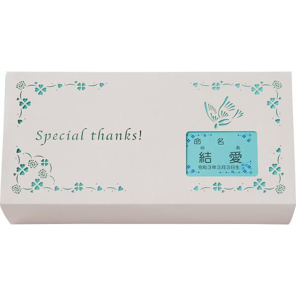感謝の気持ちをプリントした2種類のクッキーに、おめでたい末広がり型のカットバームクーヘンをセットにしました。化粧箱にお名入れをしてのお届けです。かわいいレーザーカット加工を施した化粧箱はリユースして小物入れとしてもご利用いただけます。