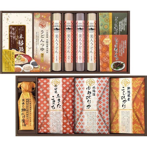 商品内容:●新潟県産こしひかり2合(300g)×1、秋田県産あきたこまち2合(300g)×1、北海道産ゆめぴりか2合(300g)×1、美人うどんもち麦(1人前)85g×2、美人うどん赤米(1人前)85g×1、美人うどん黒米(1人前)85g×1、蔵出し卵がけ醤油120ml×1、本枯節2g×3、ごま昆布佃煮40g×1、しその実わかめ佃煮45g×1、めんつゆ20ml×4