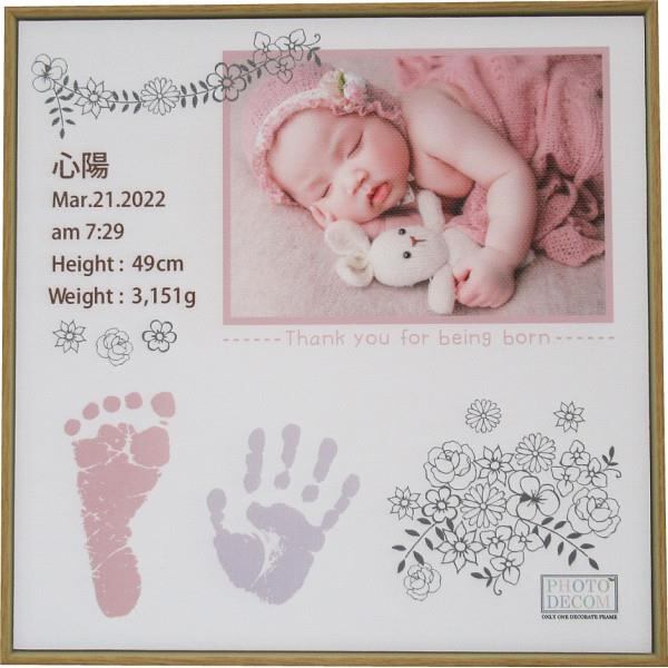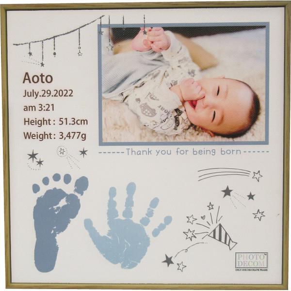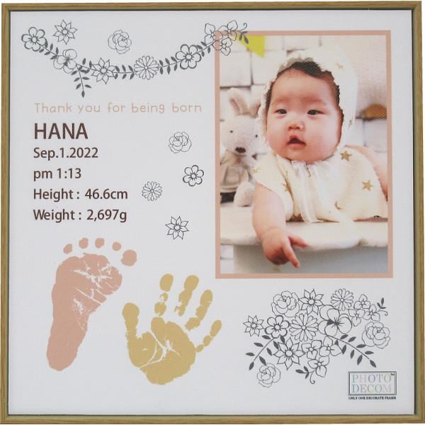 お気に入りの写真1枚+手形足形+ベビーデータ(お名前・お誕生日・お誕生時間・身長・体重)をかわいいデザインと一緒にプリントします。*写真はメール送っていただくこともできます。