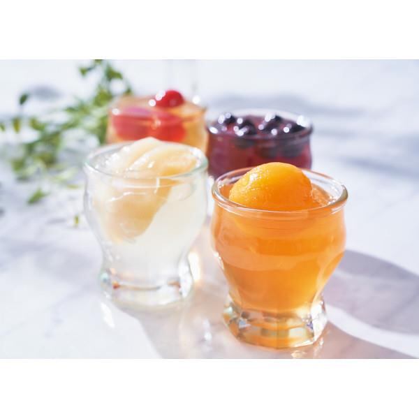 清涼感あふれるガラス容器にチェリー、白桃、びわ、ブルーベリーの4種類が色鮮やかなゼリーになりました。冷蔵庫でよく冷やして、おもてなしの一品としてぜひご賞味ください。
