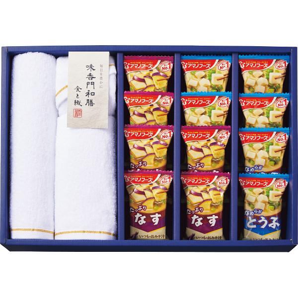 商品内容:●アマノフーズフリーズドライいつものおみそ汁(なす×6・とうふ×6)・フェイスタオル(約32×75cm・綿100%・日本製)2枚・ハンドタオル(約32×34cm・綿100%・日本製)1枚