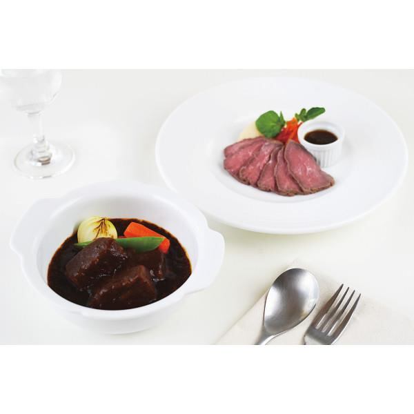 ほろほろとやわらかい牛肉を煮込んだコク深いビーフシチューと、氷温熟成とで旨味を引き出し、シンプルな味付けで低温調理した食べ切りサイズのローストビーフのセットです。