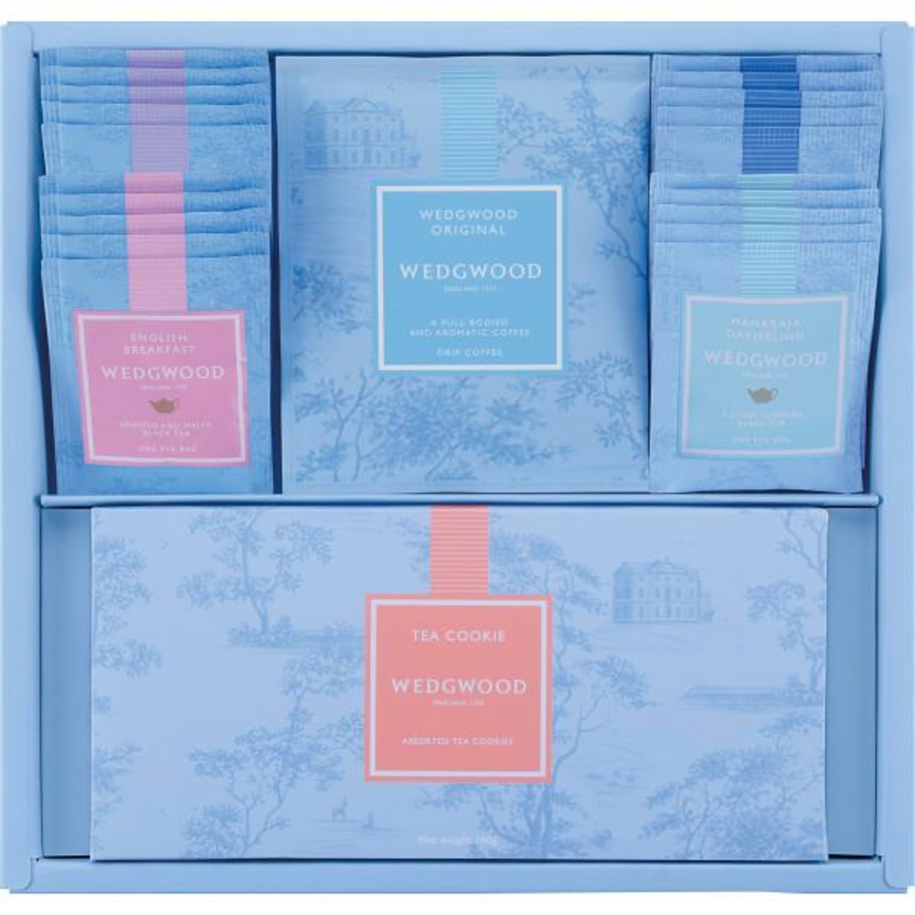 手軽にブレイクタイプを楽しめるアソートセット。お茶うけにぴったりな茶葉入りの2種のクッキーにウェッジウッドならではの上品な味わいの紅茶と中細挽きのドリップコーヒー入です。