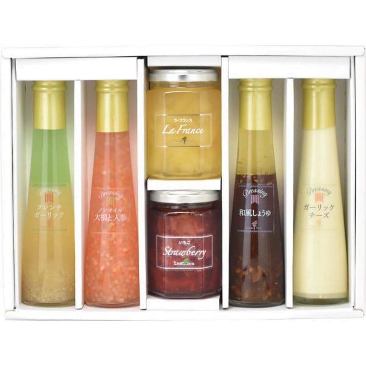 商品内容:●ジャム145g×2(ラ・フランス、いちご)、ドレッシング122ml×4(フレンチガーリック、ノンオイル大根と人参、和風しょうゆ、ガーリックチーズ)