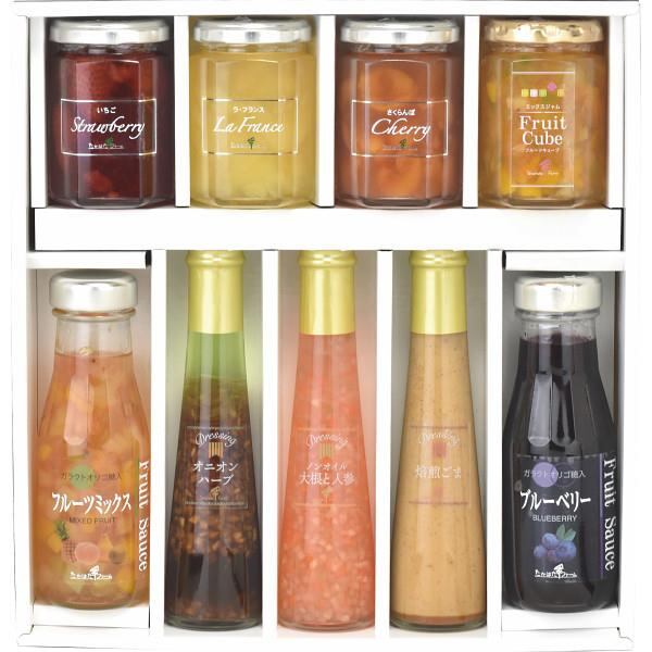 商品内容:●ジャム145g×3(いちご、ラ・フランス、さくらんぼ)、ミックスジャム155gフルーツキューブ、フルーツソース×2(フルーツミックス215g、ブルーベリー220g)、ドレッシング122ml×3(オニオンハーブ、ノンオイル大根と人参、焙煎ごま)