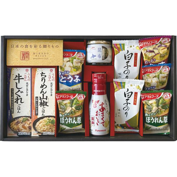 商品内容:●フンドーキンあまくておいしい醤油200ml、キッコーマン混ぜごはんの素牛しぐれ(37g×2)、キッコーマン混ぜごはんの素ちりめん山椒(27g×2)、アマノフーズフリーズドライいつものおみそ汁(とうふ・ほうれん草×各2、なす×1)、白子のり(8切5枚)×2、マルハニチロ鰹昆布45g