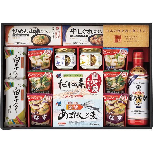 商品内容:●キッコーマンいつでも新鮮九州うまくちまろやかしょうゆ450ml、キッコーマン混ぜごはんの素牛しぐれ(37g×2)、キッコーマン混ぜごはんの素ちりめん山椒(27g×2)、アマノフーズフリーズドライいつものおみそ汁(とうふ・なす・ほうれん草)×各2、白子のり(8切5枚)×2、マルハニチロ鰹昆布45g、マルハニチロ鶏そぼろ45g、マルトモあごだしの素(4g×10)、マルトモ直火焼だしの素(4g×10)