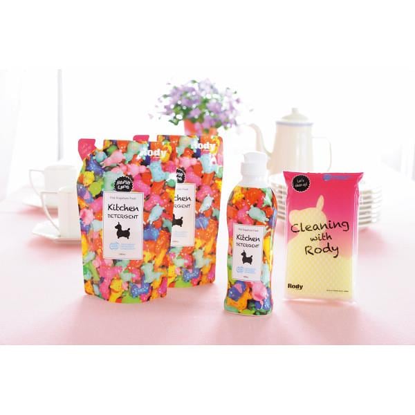 キッチンをカラフルに彩るロディのキッチン洗剤セット 置いておくだけで楽しく元気な気持ちにさせてくれそうなカラフルでキュートなデザインの食器洗剤と、キッチン用スポンジの詰め合わせセットです。食器洗剤の詰替え用もご用意させていただきました。