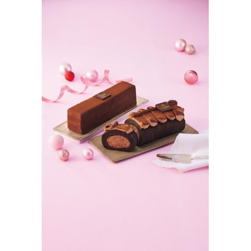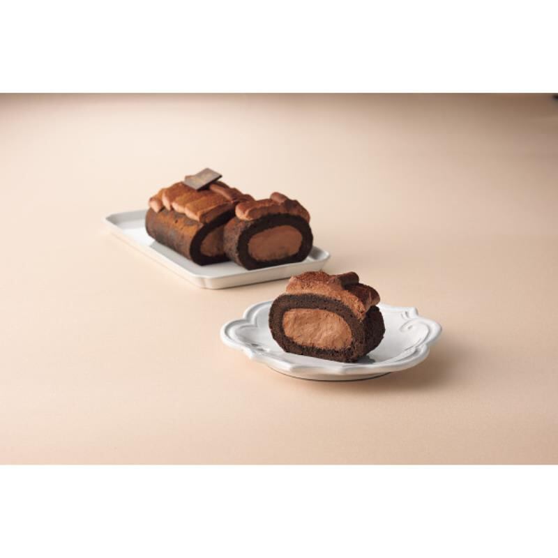 ココアパウダーを練り込んでしっとりとした食感に焼き上げた生地で、なめらかなチョコレートガナッシュクリームをロール。デコレーションにも同じクリームを使用しています。