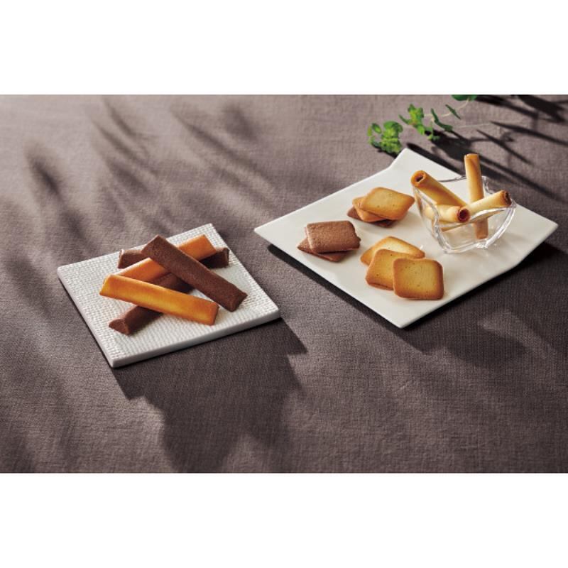 豊かな風味と軽快な口当たり。繊細でどこか懐かしいスイーツ。ロール状に小さく巻いたプティシガールと、サクサクの生地でクリームをはさんだチョコレートサンドクッキーなどを詰め合わせました。