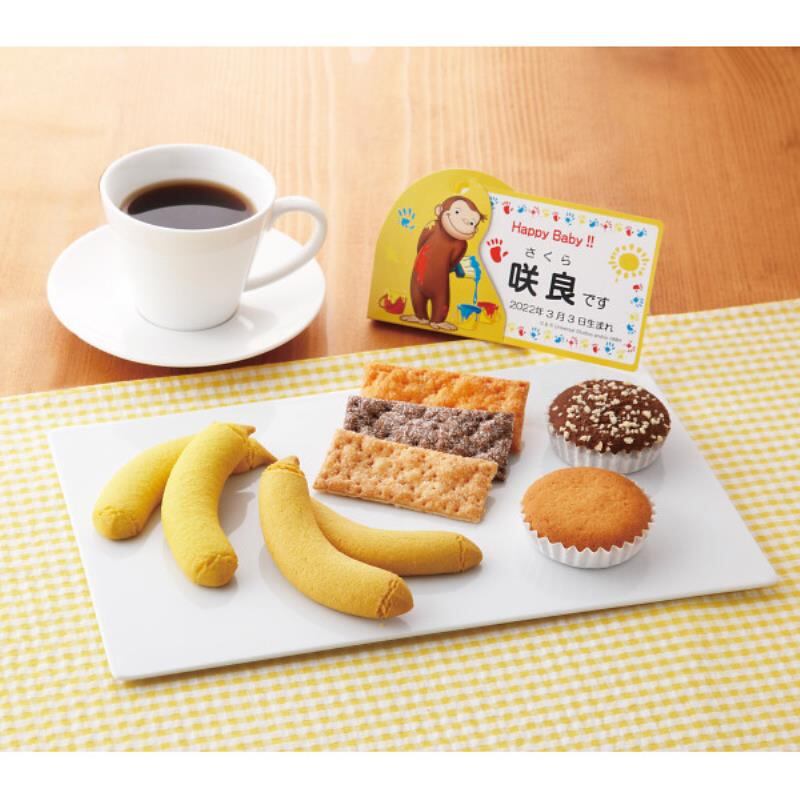 絵本やテレビで人気のおさるのジョージのギフトセット。かわいらしいデザインに囲まれたジョージがスイーツをお届け。