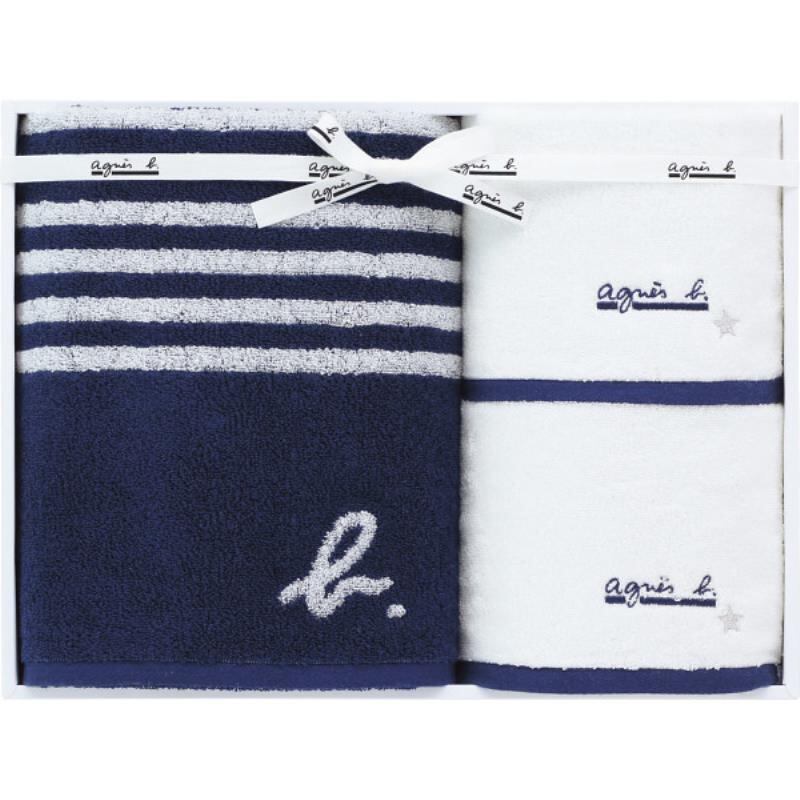 フレンチカジュアルを代表するパリのブランド、アニエスベーは、流行に捉われることなく、着心地の良さやカッティングにこだわった独自のスタイルで世界中の人に長く愛されています。象徴的なアイテムの一つであるボーダーにb.ロゴのジャガードタオルと、ブランドロゴ刺繍がポイントのシンプルなタオルを合わせました。シーズンや年齢・性別を問わずお使いいただきやすいギフトです。
