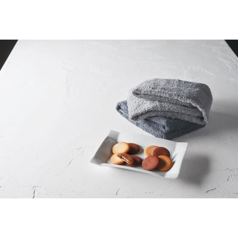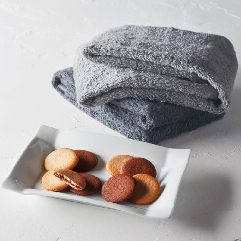 軽やかなラングドシャ生地で、チョコレートをサンドしたクッキー。「ミルクチョコレート」と「ダークチョコレート」、2種類のクッキーの詰め合わせと、柔らかな肌さわりとシルクの様な滑らかさでふんわり感が続くフェイスタオルのセットです。