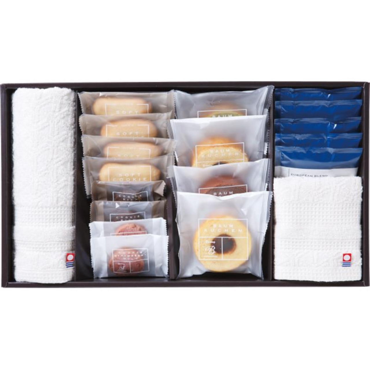 商品内容:●今治産フェイスタオル(約34×75cm・綿100%・日本製)1枚・ウォッシュタオル(約34×35cm・綿100%・日本製)1枚・ミニバウム(バニラ×2・チョコ×1・抹茶×1)・ソフトクッキー×4・クッキー(いちごミルク×2・ココア×2)・ドリップコーヒー8g×5