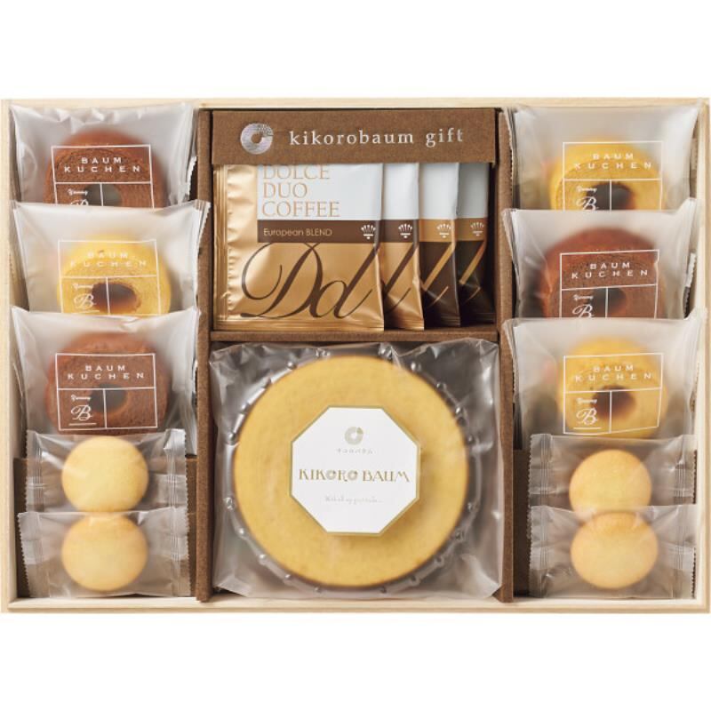 商品内容:●バウムクーヘン(北海道産生乳100%の生クリーム使用)(約14φcm)×1、ミニバウム(チョコ・バニラ)×各3、チョコインクッキー×4、ドリップコーヒー8g×4
