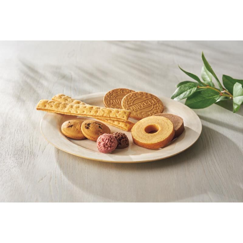 商品内容:●チョコチップクッキー×3、ロングスティックパイ×1、バウムクーヘン(バニラ)×1、ゴーフレット×2(バニラ・チョコ×各1)、チョコレートクランチ×2(ミルク・ストロベリー×各1)
