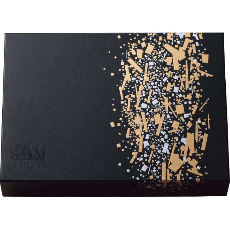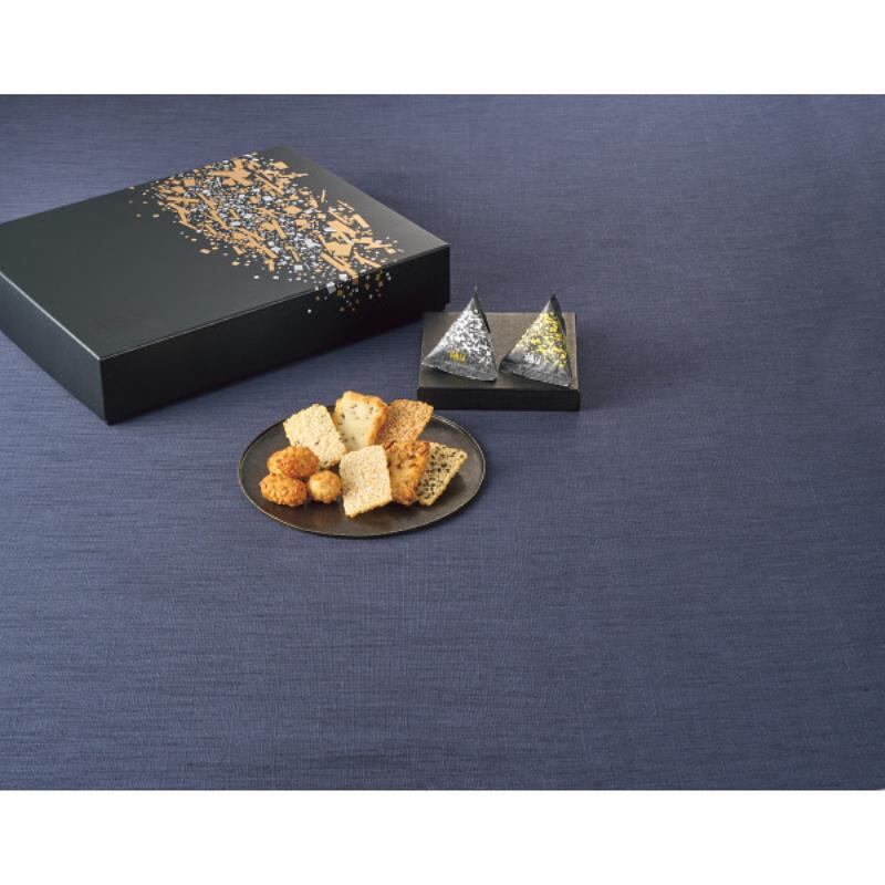 赤坂柿山の代表商品の詰合せ。もち米の粒の姿をそのままに焼き上げた「慶長」、アーモンドを丸ごと一粒おかきで包んだ「慶凰」、もち米の風味を存分に楽しめる「かきもち」の詰合せです。黒地に金銀模様のシックな装いはシーンを選ばずご好評いただいております。