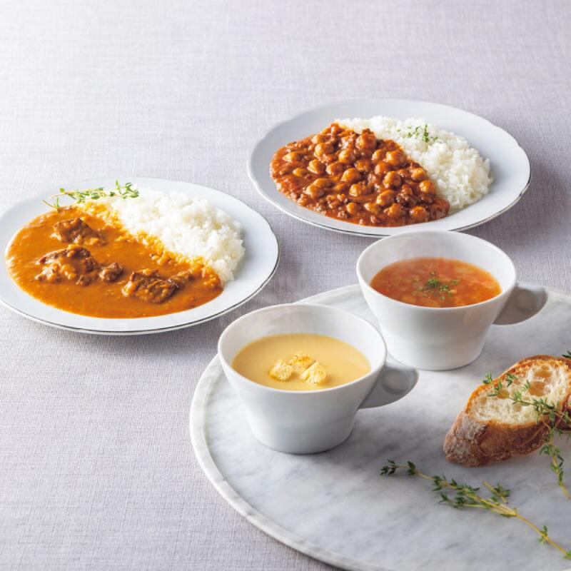 それぞれの野菜の特徴をいかして作り上げた帝国ホテルスープ3種と、スパイスの効いた具材の旨味引き立つ帝国ホテルカレー2種の缶詰ギフトです。