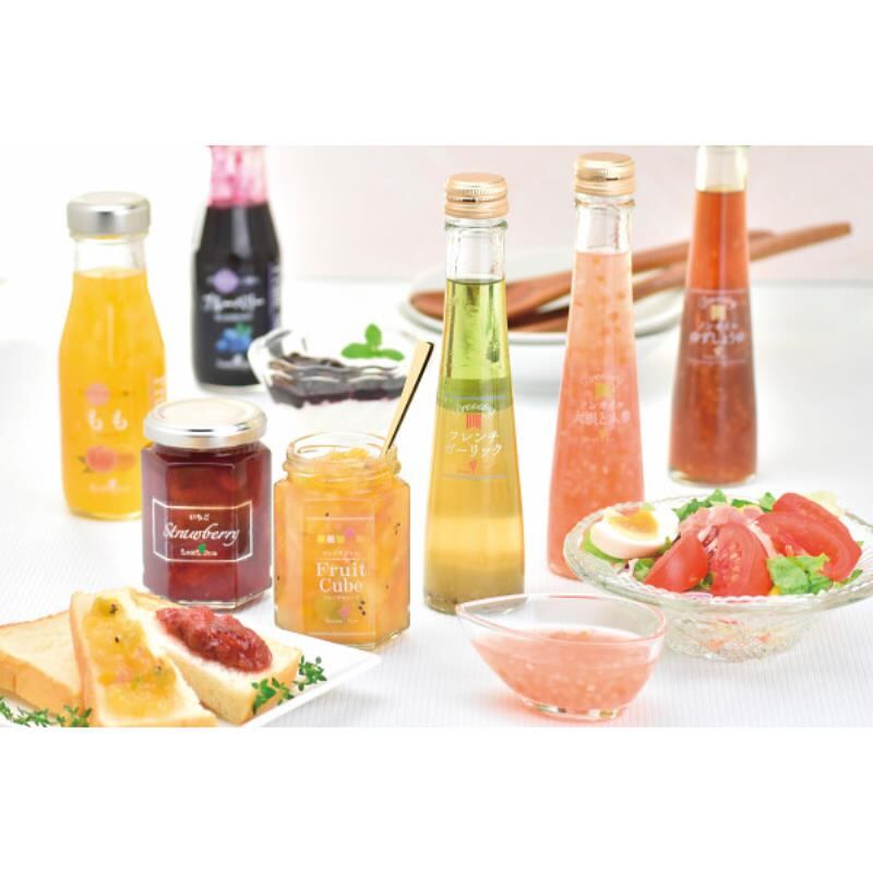 フルーツ本来の色と風味を大切に仕上げたジャムやフルーツソース、角切りにしたフルーツが入ったミックスジャム、素材の持ち味を大切に仕上げた個性的なドレッシングの詰合せです。