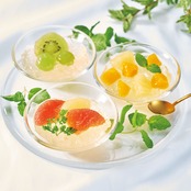 6種類のフルーツが楽しめる華やかでジューシーなゼリー。レモン果汁のゼリー液にキウイ・ぶどう・グレープフルーツ(2種)・マンゴー・パインを掛け合わせ、甘すぎない大人なゼリーに。光に反射して艶めく姿がかわいく、ギフトにもぴったりです。