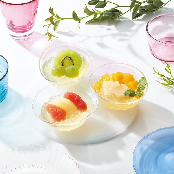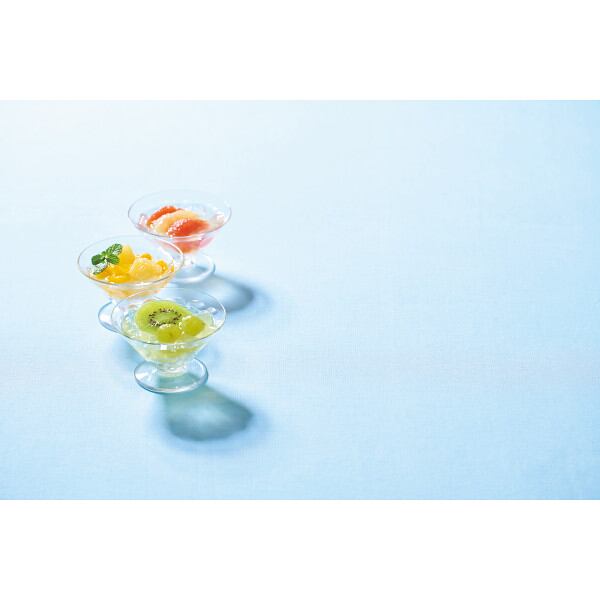 6種類のフルーツが楽しめる華やかでジューシーなゼリー。レモン果汁のゼリー液にキウイ・ぶどう・グレープフルーツ(2種)・マンゴー・パインを掛け合わせ、甘すぎない大人なゼリーに。光に反射して艶めく姿がかわいく、ギフトにもぴったりです。