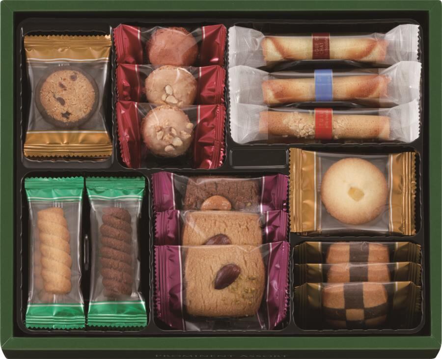商品内容:アメリカンリングクッキー×3枚、レモンクッキー×3枚、アーモンドクッキー×2枚、カシューナッツクッキー×1枚、ココア&プレーンクッキー×3枚、ストロベリーマカロン×1枚、アーモンドマカロン×2枚、コルベイユ4種×6本、ツイストクッキー2種×6本