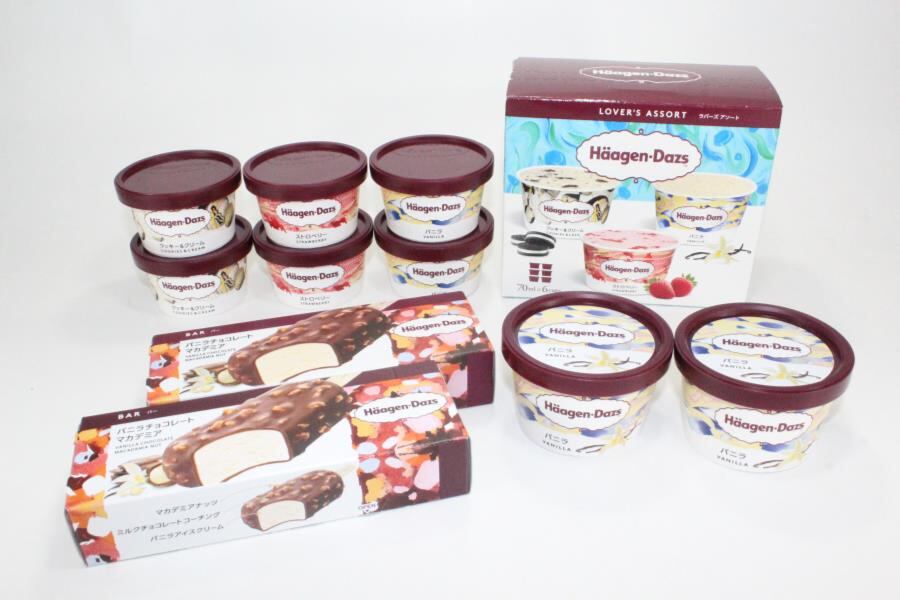商品内容:ミニカップ(バニラ)110ml×2個、バー(バニラチョコレートマカデミア)80ml×2本、ラバーズアソート(バニラ・ストロベリー・クッキー&クリーム各70ml×2)×1個