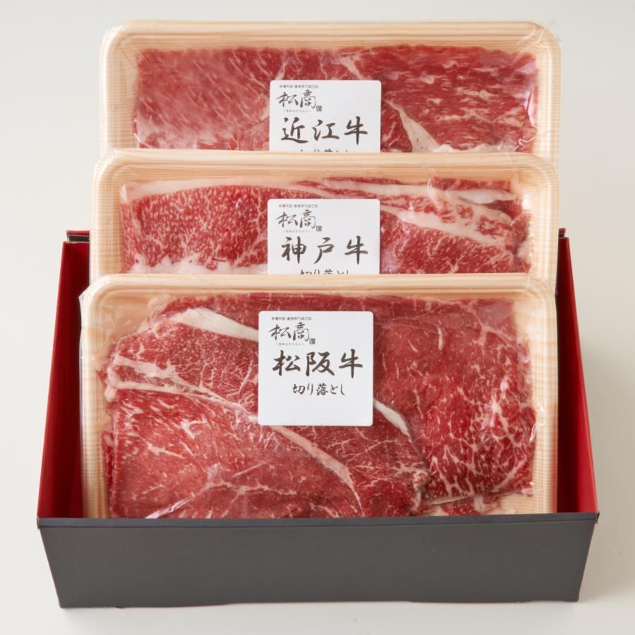 商品内容:松阪牛切り落とし:300g×1、神戸牛切り落とし:300g×1、近江牛切り落とし:300g×1