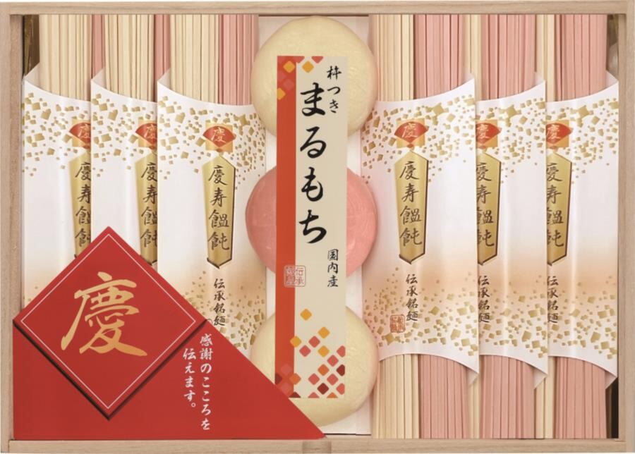 商品内容:慶寿饂飩(白・紅) 50g×各6束、杵つき丸餅(白)約30g×2個、杵つき丸餅(紅)約30g×1個