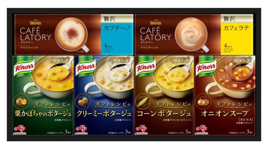 商品内容:ギフトレシピのコーンポタージュ(3袋入)×1、ギフトレシピのクリーミーポタージュ(3袋入)×1、ギフトレシピのオニオンスープ(3袋入)×1、ギフトレシピの栗かぼちゃのポタージュ(3袋入)×1、「ブレンディカフェラトリー」スティック プレミアム(贅沢カフェラテ4P×1、贅沢カプチーノ 4P×1)