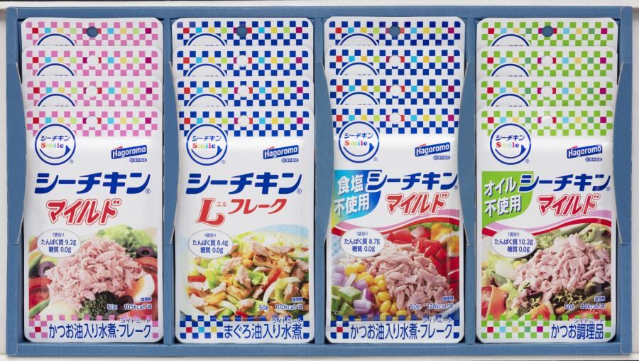 商品内容:シーチキンSmileマイルド50g×4、シーチキンSmileLフレーク50g×4、シーチキンSmile食塩不使用マイルド50g×4、シーチキンSmileオイル不使用マイルド50g×4