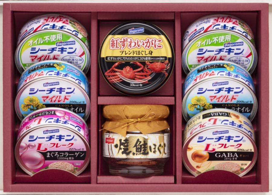 商品内容:オイル不使用シーチキンマイルド70g×2、シーチキンマイルドキャノーラオイル70g×2、シーチキンLフレークコラーゲン入り70g×1、紅ずわいがにブレンドほぐし身55g×1、焼鮭ほぐし50g×1、シーチキンLフレークGABA入り70g×1