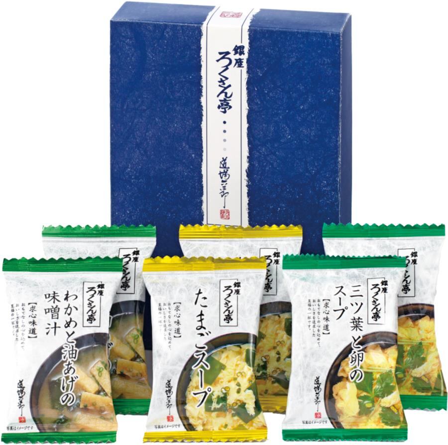 商品内容:たまごスープ×2、わかめと油あげの味噌汁×2、三ツ葉と卵のスープ×2