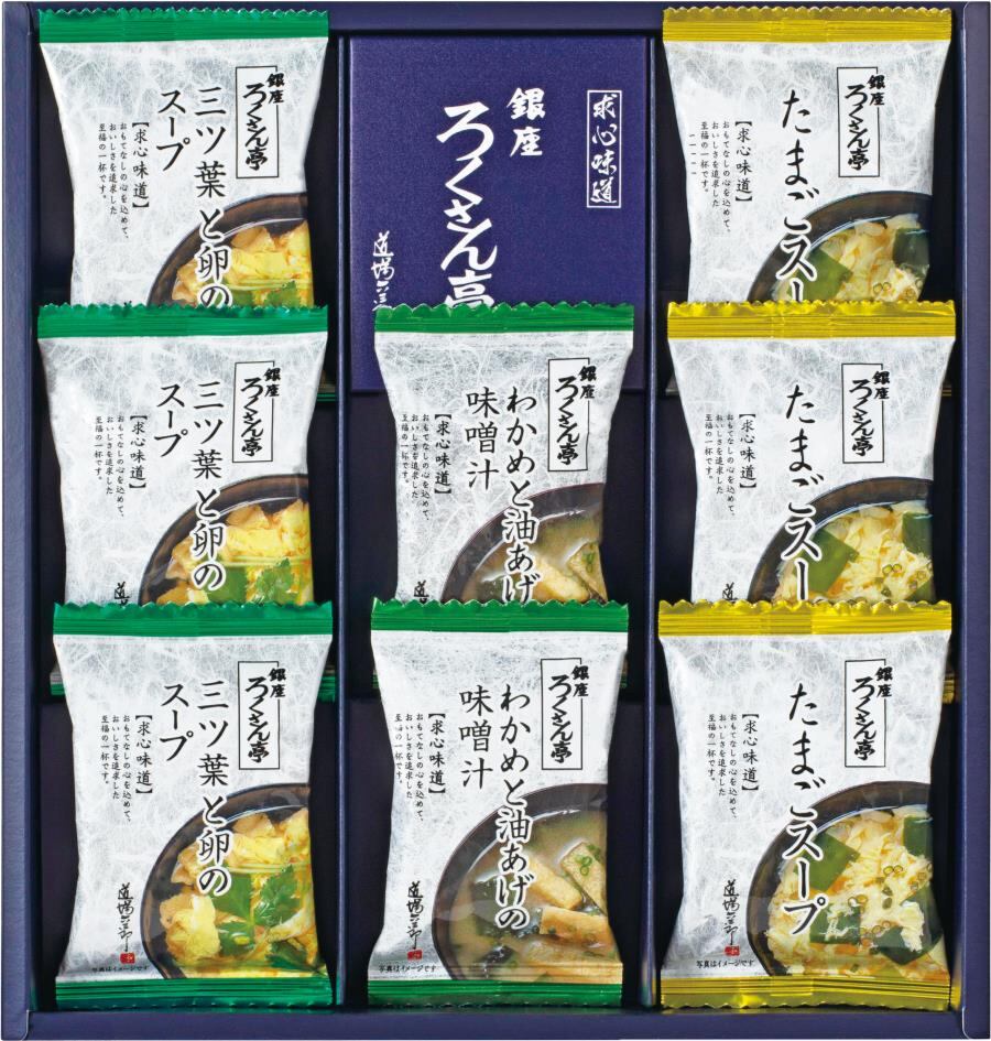 商品内容:たまごスープ×3、わかめと油あげの味噌汁×2、三ツ葉と卵のスープ×3