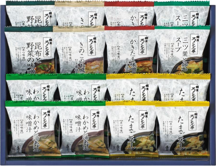 商品内容:たまごスープ×4、わかめと油あげの味噌汁×4、三ツ葉と卵のスープ×2、きのこのお吸物ひき雲仕立×2、かきたま味噌汁赤だし仕立×2、昆布と野菜の味噌汁×2