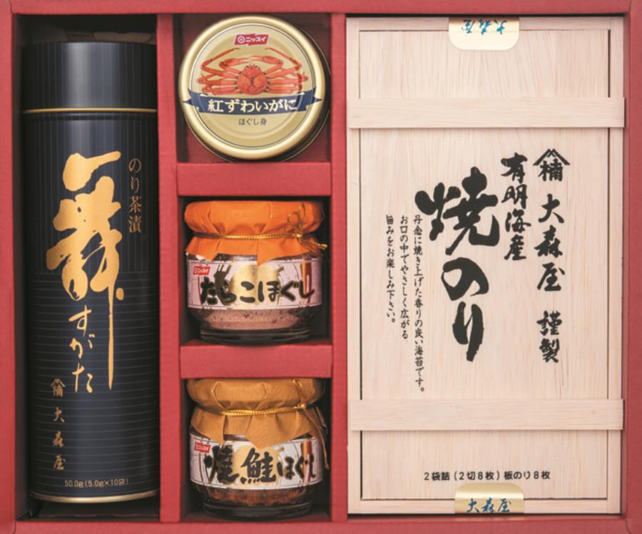 商品内容:舞すがたのり茶漬(5.0g×10袋)、焼のり木箱2袋詰(2切8枚)、紅ずわいがにほぐし身(55g)、たらこほぐし(50g)、焼鮭ほぐし(50g)