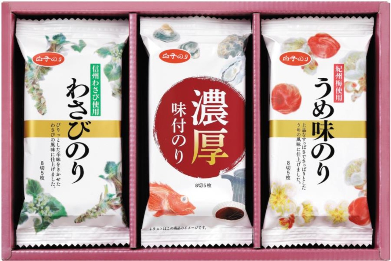 商品内容:信州わさび使用わさびのり(8切5枚)×2、濃厚味付のり(8切5枚)×2、紀州梅使用うめ味のり(8切5枚)×2