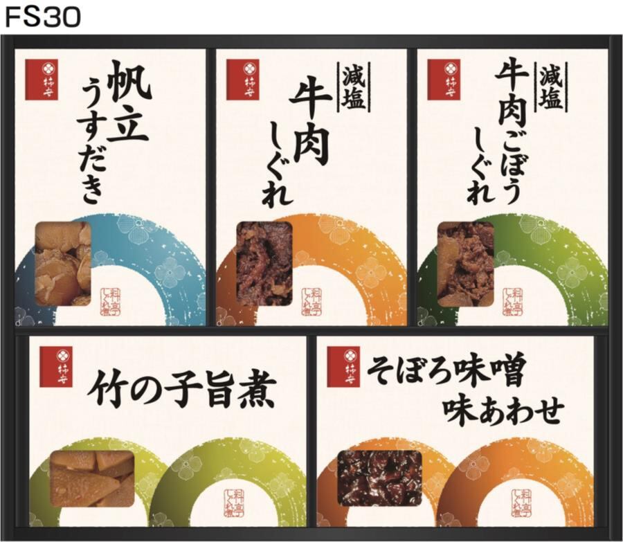 商品内容:減塩 牛肉しぐれ50g、減塩 牛肉ごぼうしぐれ50g、帆立うすだき40g、竹の子旨煮50g、そぼろ味噌味あわせ90g