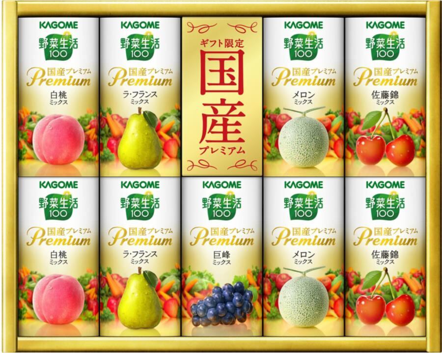 商品内容:野菜生活100 国産プレミアム (白桃ミックス、メロンミックス、佐藤錦ミックス、ラ・フランスミックス)各125ml×2、野菜生活100 国産プレミアム 巨峰ミックス125ml×1