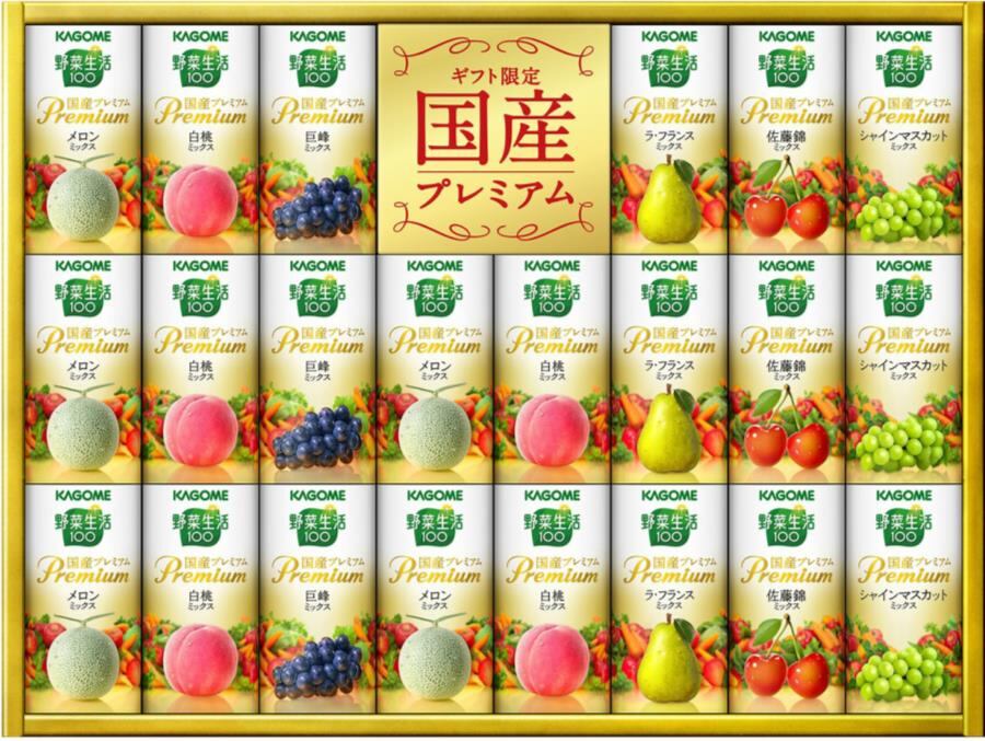 商品内容:野菜生活100 国産プレミアム(白桃ミックス、メロンミックス)各125ml×5、野菜生活100 国産プレミアム (佐藤錦ミックス、ラ・フランスミックス、巨峰ミックス、シャインマスカットミックス)各125ml×3